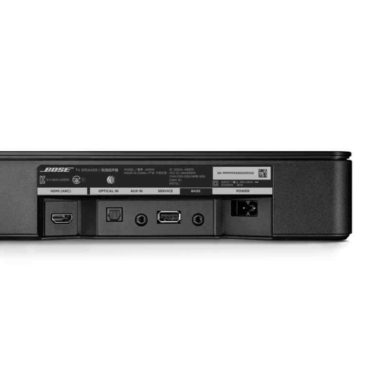 | Contenido de la caja | Bose TV Speaker; control remoto con batería preinstalada; cable óptico; cable de alimentación; guía de inicio rápido. |