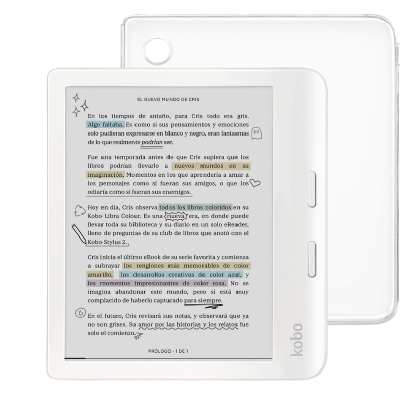 El Kobo Libra Colour es más que un simple lector de libros electrónicos. Con su pantalla E Ink Kaleido 3 de 7" y una experiencia única a color, te permite resaltar, tomar notas e interactuar con tus eBooks de una forma completamente nueva. Junto con la funda protectora transparente, tu Kobo Libra Colour estará protegido y podrás personalizarlo según tu estilo. ¡Haz de tu experiencia de lectura algo mucho más personal!