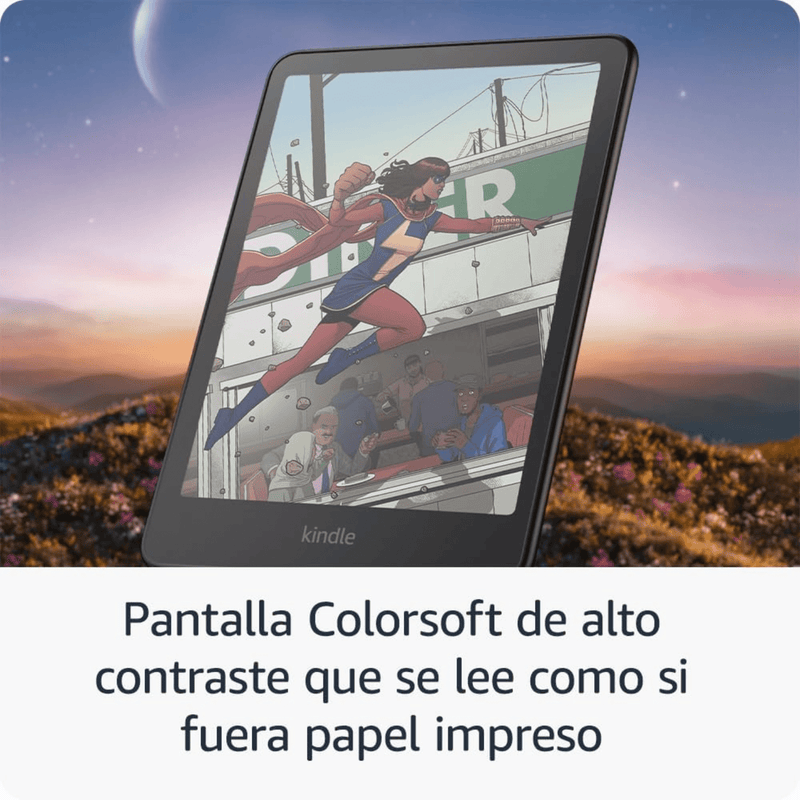 El Amazon Kindle Colorsoft transforma cada libro en una experiencia más interactiva y cómoda. Su pantalla E Ink Colorsoft de 7" y 300 ppi ofrece textos nítidos y colores suaves que cuidan tu vista, mientras que su diseño ligero e impermeable (IPX8) te permite leer donde quieras, incluso cerca del agua. Con 16 GB de almacenamiento y conectividad Wi-Fi y Bluetooth, tendrás tu biblioteca completa siempre a mano.
