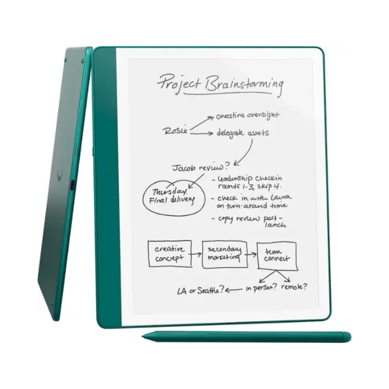 El Kindle Scribe destaca por su diseño elegante con un acabado en Jade Metálico que combina estilo y funcionalidad. Gracias a su conectividad moderna, ofrece Wi-Fi de doble banda, Bluetooth y puerto USB-C, brindando una experiencia fluida y sin cables para disfrutar de tus lecturas, notas y documentos con total libertad.