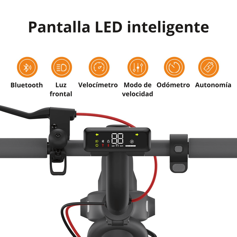 Seguridad y estabilidadViaja con confianza con frenos delanteros EABS y traseros de tambor, neumáticos de 8,5” y suspensión delantera Front Fork que absorbe los impactos de la ciudad. Su iluminación delantera y trasera garantiza visibilidad en todo momento.